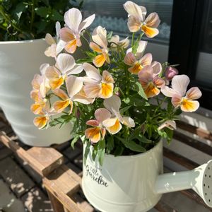 神戸ビオラ ハニーブルーフェイスイエローさん💕 今季は憧れのパンビオさんを求めて園芸店に行くことが多いですが、園芸店でもホームセターでも目的の方のみで目的の子以外の子を連れ帰らないという、いつになく偉い私が続いています😊 (実は単にもうバラ鉢どころか、小さな鉢植えさえ置く場所がないだけなのですが) けれど、この子は今季唯一、一目惚れでお連れした子です。 ふりふりでもないのですが、この色とお顔に惹かれてしまいました🐰