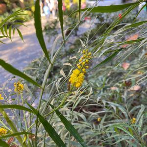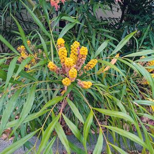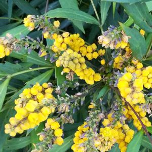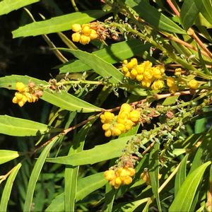 ホソバヒイラギナンテン 陽に照らされキラキラ✨💛🎶💕 メギ科 メギ属 常緑低木 葉は互生する長さ10~28cmの奇数羽状複葉で、枝先に集まる傾向があります。 小葉は2~5対あり、長さ4.5~14cm、幅0.9~2.5cmの狭楕円形、少数の刺状の鋸歯があります。 枝先に直立する総状花序を出します。 花は淡黄色の6弁花です。 果実は液果で黒紫色に熟し、果皮 が白い蝋粉を帯びます。 その名の通りヒイラギナンテンより葉がほっそりとして整い、棘も目立たない。 また花が咲く時期が違います。 こちらは秋に咲くのに対して ヒイラギナンテンは冬、年明け早春に咲きます。