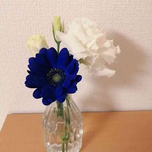 青いガーベラとトルコキキョウ 濃い青と白はやっぱり合う〜✨ 壁が白でトルコキキョウ目立たないけどフリルみたいにフワっと咲いて本当可愛い🙌 トルコキキョウ白 花言葉 “思いやり” ガーベラ青 花言葉 “神秘”