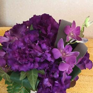 前〜に作った花束💐 大輪のラナンキュラス‼️ 寒いけど、春のお花がたくさんお花屋さんに並ぶ季節!楽しみが増えるな💖 ラナンキュラス ラクスパー トルコキキョウ紫 宿根スイートピー ユリ、ミニバラ