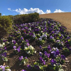 伊勢崎市民の森公園 草笛の丘に 植えられたパンジーが、青い空と白い雲に映えて、美しい光景を 創り出していた。😊👍🎶📸