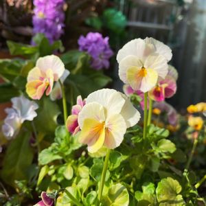 ビオラ十六夜(いざよい)さん ヌー様と同じ鉢植えにおります わたし今日まで十五夜さんと思ってました😂 どおりでタグが無かった訳ね💨 ご、めーん😂 たまたま写り込んだ 宿根イベリス なんと蕾がついてて ハッピーラッキークッキー🍪😆 もりもりとは咲かないかもだけど 楽しみが増えました💞