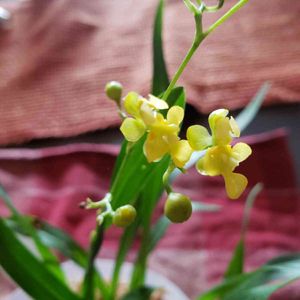 Onc.cheirophorumさん 原種の黄色くて小さな可愛いお花です。花芽があがってから結構待たされました😳🌿1本しかあがっていない花芽。だのになのに先端はしけてしまいました😢💦残念😅 オンシジウムといえば、もうすぐトゥインクルのフレグランスファンタジーが咲きそうになっています😃🎵 トゥインクルは初心者向けのランのだけれど、今年結構軟腐病のような感じでバックバルブからやられていって☆になってしまった子もいます😨🌿