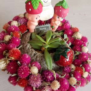 昨日頂いた千日紅のリース(友人作、グルーガンで1つずつくっつけたとか)と 挿し芽ばかりの名前のわからない多肉ちゃん、寄せ植えになるかなあ?六種類無事根付いた😆 ❤️15さんの🍓の日に参加します。