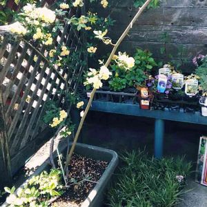 ホームセンターのモッコウバラ 幹にちょろっと枝に咲いてます。 こんな、仕立ても出来るんですね。😄😄😄