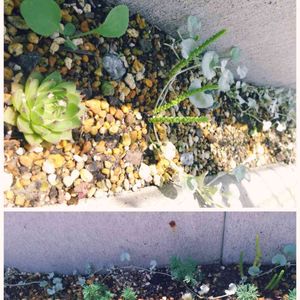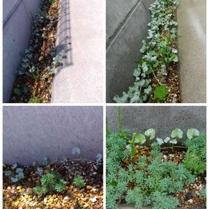 駐車場の隙間に地植えした方々(雑草もいる笑)。 多肉は心配要らないと思ってましたが、ディコンドラもしっかり根付いていい感じで感激です😭❤️ 豪雨も日光もガンガン🌞 それでもたくましく育ってくれてます🙌