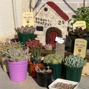 昨日の戦利品😆アルルさんではシルエットとモルタルハウス🏡 ルポさんでは、リトルミッシーやプレリンゼなどいっぱい🤣1000円以上で苗一個プレゼント。でもさっき台から落としてこっぱ😭😭😭葉挿し行きになりました。 もうお腹いっぱいってなり、帰りによってって市場に寄ったら、ここにも多肉❗️❗️ ルポさんで悩んだアロマティカスとブラックキングが一緒に帰ろうと囁いた🤣