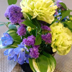 おはようございます! カーネーションとデルフィニウムとスターチスを組み合わせたテーブルフラワーアレンジメント🍀 グリーンライムのカーネーションに初めて出会い、爽やかでした✨✨😃 組み合わせが素敵でした‼️ 今日も素敵な一日を🍀