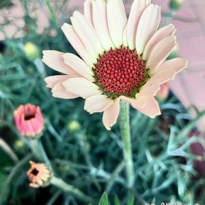 (*´▽`)v☆*:;;;;;:*☆おはようございます☀ 私の春に欠かせない➰☘️ ローダンセマム にこんなコがいた〰️〰️〰️o(ˊ▽ˋ*)o "ムーン🌙" 🟡 →→→⚪ 色変するらしいけど 淡いサーモンピンクが 可愛い꒰◍ᐡᐤᐡ◍꒱ ですゥ