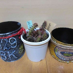 【多肉植物】 右:100均鉢から単独飼い 中央:透け感満喫したいので単独飼い 左:”サヴァ缶”食べたので寄植え 息子の学校は学校行事の代休なので、仕事を休んだ私。 三日月さんの株が数本あったので、1本サヴァ缶に入れてみました。 右の鉢のコは横っちょから小さい脇芽?2つ出てるのです。安定悪くグラグラなんだけどな。 他のコも早く大きくなればいいのに。
