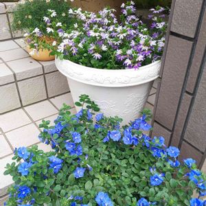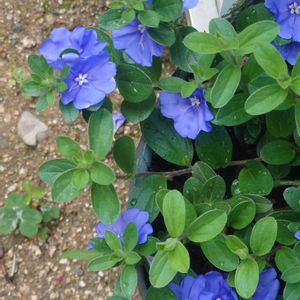 おはようございます。 エンボルブルス ブルーラグーン。 3号ポット苗を、5号鉢に、植え替えて約1ヵ月 ピンチしたので、花が、ポツポツ咲き始めました。 鉢のそこから根が出てきました。 そろそろ、鉢増し植え替え予定しています。 7号深鉢に、植え替えます。 もう一度ピンチした方が良さそうですが、花を見たいので、鉢増し植え替えしてこのまま育てます。 ピンチしたあとの挿し芽したハンギングバスケットも、枯れずに何とか、育っています。