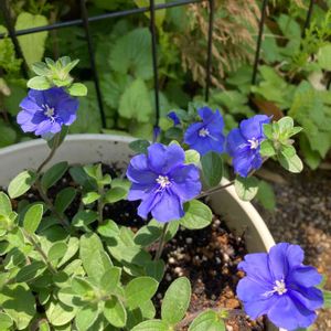 エボルブルス ブルーラグーン 冬越しした株の花数が増えてきました 冬の初めに短く切り戻した後 軒下で冬を過ごしました 暖かくなってからは良く日の当たる場所に移動しています 寒い間は真ん中が寂しくて 枯れもせず、でも生き生きともせず、な状態でしたが今月に入ってから勢いが出てきました🌱 今年こそこんもり花盛りにさせられるでしょうか💠 頑張れー!