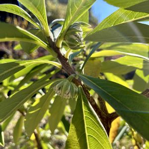 今日のお花🏷️ミツマタ 2024年11月30日、🍁紅葉の殿ヶ谷戸庭園でミツマタはまだしっかりと葉っぱを携えてツボミは冬に備えてもふもふし始めていました。🥶大寒の頃までに葉っぱは全て🍂散ります。 2枚目、お彼岸すぎの花の散り際に、新葉が芽吹きます。2023年03月26日📸佐川町牧野公園