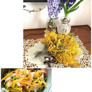 ドライになったナミモザを玄関に( ⸝⸝⸝ᵒ̴̶̷ωᵒ̴̶̷⸝⸝⸝) 春らしく桜の枝を添えて🌸💛 ヒヤシンスも色の違いを堪能💙💜 💛黄色い人参の酢の物 キレイな黄色がなんだか嬉しくて😚 桜の枝は以前にご飯屋さんで箸置きとして出されたものを頂いて帰り飾っています♪