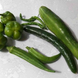 夕方の収穫♪😆 中長ナス3本、オクラ2本、きゅうり(夏すずみ)1本、クレソン少々、バジル1本