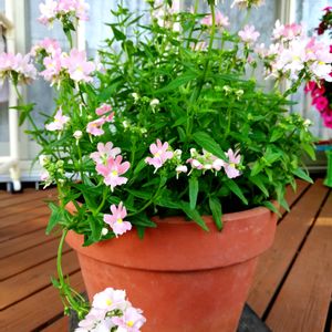 🌸ネメシア メーテル エレーヌ 無事に夏を越すことが出来て、可愛いピンクのお花が咲き始めました😍 一本だけ下で風に揺れて、「お帰りなさい」 と、お辞儀するように家族を迎えてくれる可愛い子🌸 この種類は香りがとても良くて、ずっと側に居たくなります💕 う〰️ん、幸せ感じます🍀