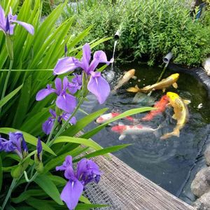 手作りの小さな池のカキツバタが今年も咲いてくれました🐱 無事に冬を越した鯉たちも元気そうに泳いで、良い眺めです😃