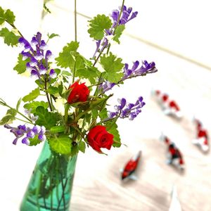 午後の庭から☕️ 【🎏鯉のぼりの代わりに】 今年は鯉のぼりを見る機会が少なかったな… テーブルの上に鯉のフィギュアを並べて 大人の為の子供の日😄 お庭に咲いた春の花 🌹ミニバラ🌹 🌊タツナミソウ🌊 コレ何だったかな⁉️
