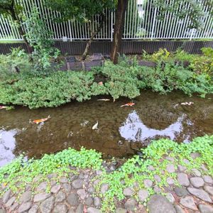 番外編 今日は横浜市都筑区佐江戸の人工河の江川の近くに仕事で来ています。 朝の河の様子です。 綺麗な錦鯉が泳いでいます。 緑の名前はわからないです。