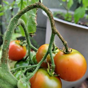 これから すごい雨☔が降るようです💦 中玉トマト🍅 まさかの肥料不足で ミニトマト🍅より 少しだけ大きい🤣 向こうに見える葉っぱは 挿し木からのウツギとアブチロンです😊 挿し木鉢から芽がでたので 植えたら なんか ツユクサみたい😅 リナリアちゃんと一緒に 瓶で冬を過ごしたユーフォルビアちゃん いけるかも٩(๑❛ᴗ❛๑)۶
