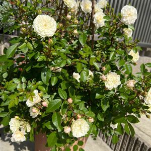 ミニバラグリーンアイス🤍 ミニバラもこんなに大きくなるんですね 垂れ過ぎて、剪定で残して置いた 枝に絡ませたけど… 来年はどうしましょう🤔