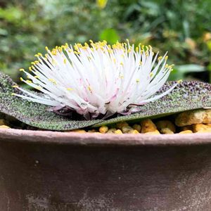 長いオシベとザラザラ葉っぱが特徴的なマッソニア ロンギペスが咲きました♬♬