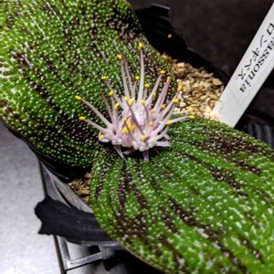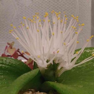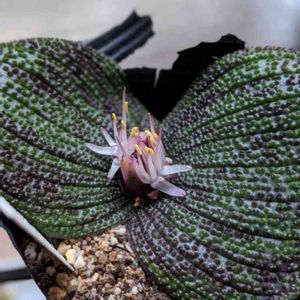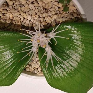 マッソニアが咲きました。ラベルはプスツラータになってますが、どうやら最近名前が変わって、今ではロンギペスと言うみたいです。葉っぱの模様が面白い種類です。