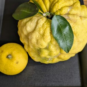 鬼柚子(獅子柚子) この大きさと、ゴツゴツした見た目から名前がついたのでしょうか? 王林と比べてみるとこのサイズ感 柚子って呼ばれてるけど、実は文旦の仲間だそうです