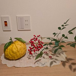初冬の素敵な実を頂きました🤗 ①鬼ゆずとナンテン ②葉っぱが付いたままのおミカン 風水では、『玄関には、明るい色が良い』と言うので下駄箱の上に飾りました🤗 葉付きおミカンはおごそかな感じがしますので、大事に飾ってから食べることにしました🐰 これをご覧になられた花友さんにたくさんのいい事があります様に🙏