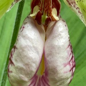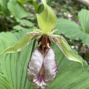 『今日の花』『クマガイソウ』 アップで見れました👀 クマガイソウ ラン科アツモリソウ属 の山野草です🌱 竹林、杉林などの 薄暗い場所に生育します‼️ 葉っぱは、2枚が対になっていて 扇形、シワがはいっていて 特徴があります‼️ 花はもっと特徴的で… 昔の武士が背負っていた『母衣』 に似ています‼️ クマガイソウ、アツモリソウと共に 源氏合戦の 熊谷直実(くまがいなおざね) 一ノ谷の戦いで、彼に討たれた 平敦盛(たいらのあつもり) にあてた名前になっています‼️ 袋状の形が面白いですよね🤣