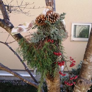 庭にあったもので作ってみたスワッグ。 葉が落ちて寂しくなった玄関前のヤマボウシに引っかけました。