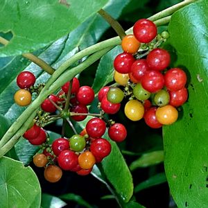テカテカの葉とカラフルな実🔴🟢🟡すぐ見つけられる🎶 ツヅラフジ科の実は美味しそう🎶 残念ながら食べられるかどうかは わかりません💦💦