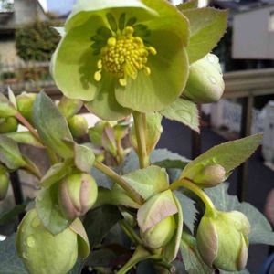 今朝の庭 やっと開花❣ 「シルバーリーフ」 クリスマスローズ ステイルニー 緑花 蕾の房にびっくりです。