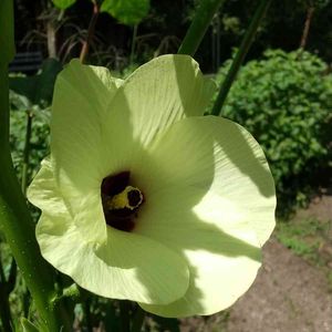 こんにちは✨😃❗ 今日も快晴で、すでに暑いです😵💦 そんな強い光の中でも、オクラの花は元気に咲いてます🌼✨😊