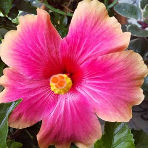 おはようございます☔ 大雨特別警報が出て、気温24度、涼しい朝ですが今日も明日も☔☔☔ 玄関先で綺麗に咲いておはよう、目があったね! ハイビスカス ミセスユミ🌺 まだ蕾、21個ついてます。 これからもまだまだ楽しませてくれますね🎶🎶