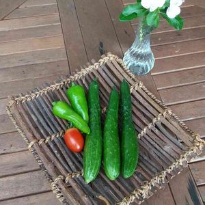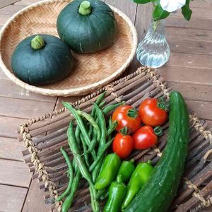 こんにちは✨ 昨日から雨が降り続いています🌧️ 朝、小雨になったタイミングで慌てて収穫🎵 キュウリ1本、ピーマン3個、トマト4個、インゲン😊💞