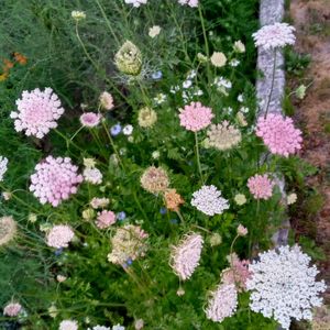 アスパラガスの隅に昨年の零れ種から 【ノラニンジン】が咲きました(°▽°) 下にはニゲラ、後ろにはコキアも。猛暑に雨が降らず芝が茶色に枯れても零れ種から咲く花は強いです。アッパレ👏