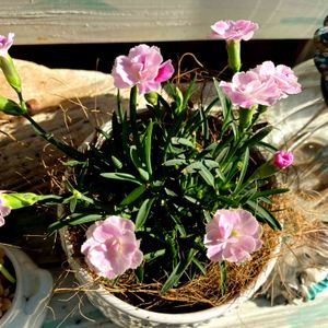 おはようございます😃 眩しい日差し☀️青空💙 先日早めの誕生日プレゼントに🎀と、 叔母が送ってくれた花苗のひとつで なでしこ さくらピンク🌸 優しい可愛らしい色合いです💕😊