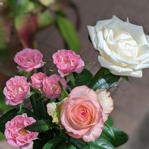 今日行ったお花屋さんで20%引きしたうえに会計の所で花束のプレゼントがありました💐 早速花瓶ヘ… 何歳になっても花束は嬉しい😄🎶✨ バラの種類はわからないけど…挿し芽できるかなぁ…👀!