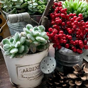 この前のナンテンをジョウロに入れてみた(*^ω^*) もけもけの多肉ちゃんも、100均の缶に入れていっしょに撮影(*´∀`)♪ 植え替えは、春まで我慢( ̄^ ̄)