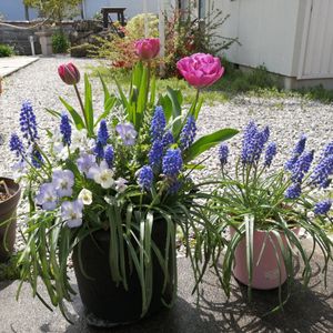 冬の間、ビオラばかりだった鉢が、今やこんなにもモリモリ。 玄関先が華やかになりました。