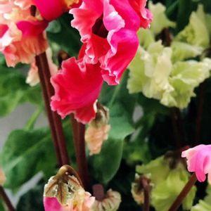 平和に 震災を忘れずに 🌏地球を♥️生命を大切に せっかくのシクラメン 蕾はいっぱいあるのに クネクネ お花達も貧相⤵︎💧 「どげすーだ…傾いとーが…」 花友35ちゃんの目が 👀キラリ✨✨ 【葉組み】を始めた テキパキテキパキ 誠心誠意💗お心こもりの葉組み 数分で姿勢が良くなり そしてー 数日で美しく咲き誇っちょるー⤴︎✨✨ こりゃまたなんだら⤴︎✨✨ だんだん(^人^)💓