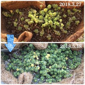 こんばんは🍀 今日は我が家の斑入りタイトゴメの成長記録です😃 増やしたくてハサミでチョキチョキ✂️切ったのを土に挿しておいたのが順調に増えてくれているようです😊 ダイソーで購入したココヤシファイバーのハンギングバスケットで育てているのですがボワっと膨らんできちゃった💦ある日突然底が抜けたりしないと良いけど…😱💦💦