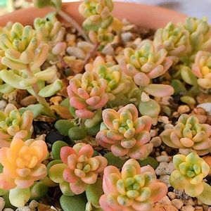⬅️🍂ミルクゥージ 「ミルク+宇治」がなまったものだって!面白い🤣 モリムラ万年草の斑入り種。 国産🇯🇵なので強いはずだが、去年夏に消えた😭 ➡️右🍂チョコレートボール マツノハマンネングサの園芸品種。 これも、箱根などの国産🇯🇵。 と言っても高山植物、夏は弱い💦 ↙️下左🍂斑入りタイトゴメ これも、日本🇯🇵原産のタイトゴメの斑入り種 タイトゴメは、川沿いや、海岸に自生してるらしい。 これは、斑入りで紅葉で先端明るくなります。思わず買ってしまった。 ↘️下右🍂オオゴンマルバマンネングサ 🇯🇵日本産の黄色種。 一部紅葉してます🍁 セダム楽しいね🤣🎶