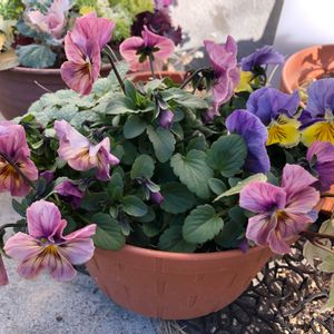 セール品のビオラとパンジー100円ぐらいが綺麗な色で咲いている アンティークカラー?☺️ 後方にはチューリップの球根を植えてるので春にチューリップ🌷咲くはずで楽しみにしたいます✨