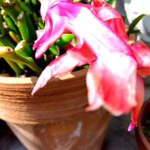 しゃこばさぼてん? お連れさんのおばあちゃんに頂いたさぼてん、頑張って今年も寒いベランダで咲いてくれてますよ~🥰 今年は植え替えよう❣❣ 🌱🌱🌱