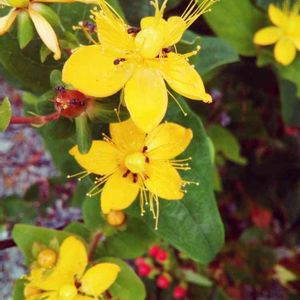 今日のお花、オトギリソウ。 鮮やかな黄色の花を咲かせ、秋には赤く可愛い実をつけます。 昨年8月撮影。 散歩道にて。