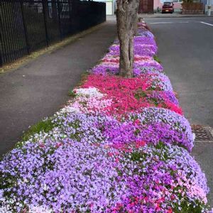 道路沿いに咲く満開の芝桜。 地面を覆い尽くすように、まるで絨毯のようです。 散歩道にて。