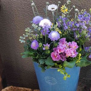 ブルーのブリキコンテナに♪スカビオサの寄せ植え スカビオサやネメシアの淡いブルーと 後ろから白いローダン セ マムが咲いてくる寄せ植えです #garden#gardening#flower#ガーデン#ガーデニング#花の寄せ植え#コンテナガーデン#ベランダガーデニング#園芸#鉢植え#ヤフオク これから出品します#花と緑のある暮らし#植物のある暮らし#humminggarden