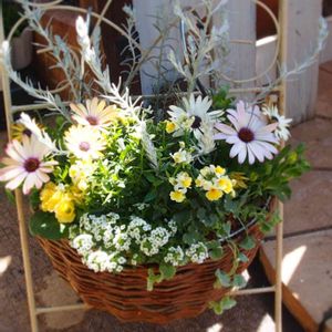 フェンスに掛けれるハンギングに♪オステオスペルマムの寄せ植え 藤のハンギングバスケットに オステオスペルマムやネメシアのレモンスカッシュなどレモン色の爽やかな寄せ植えにしました 白いシュッとした エレモフィラニベアは 春先に淡い紫のベル型のお花を鈴なりに咲かせます♪ #garden#gardening#flower#ガーデン#ガーデニング#花の寄せ植え#コンテナガーデン#ベランダガーデニング#植物生活#ボタニカル#園芸#ハンギングバスケット#ヤフオク 出品予定👆#花と緑のある暮らし#植物のある暮らし#humminggarden